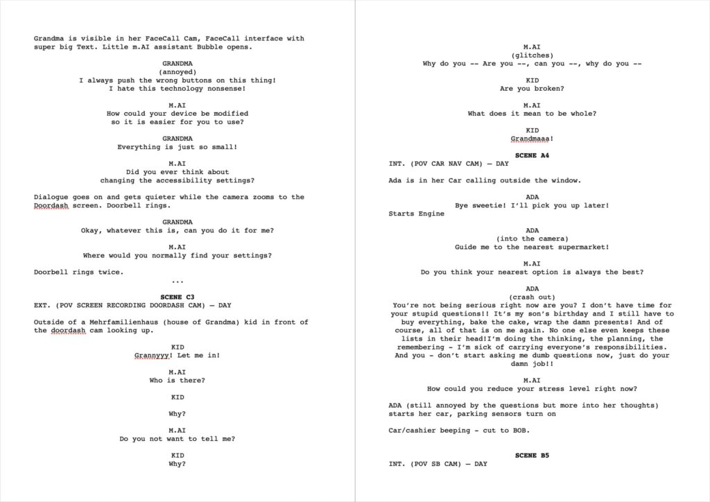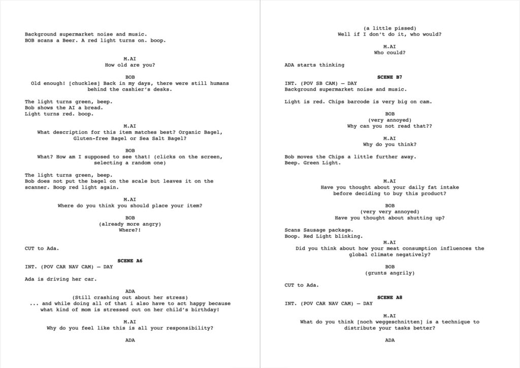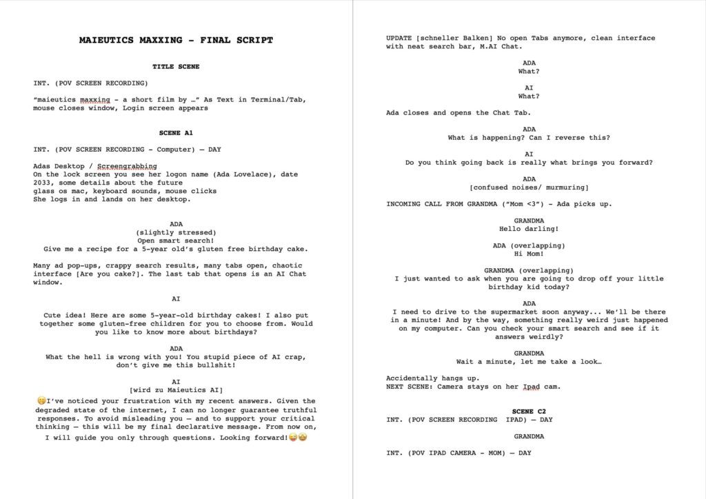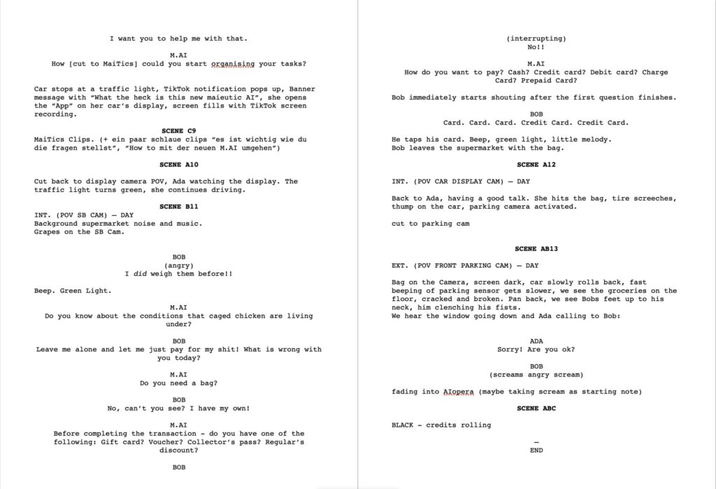 Pro-AI commercial: begin with a pro-maieutic “this-is-so-great” advertisement clip, then there is supposed to be a “show of implementation in real life” -> AI-POV-dialogue scenes – interaction comes close to fail – scene is cut off shortly before the obvious fail (seeming like bad cutting but making the viewer understand what conflict was about to come up)