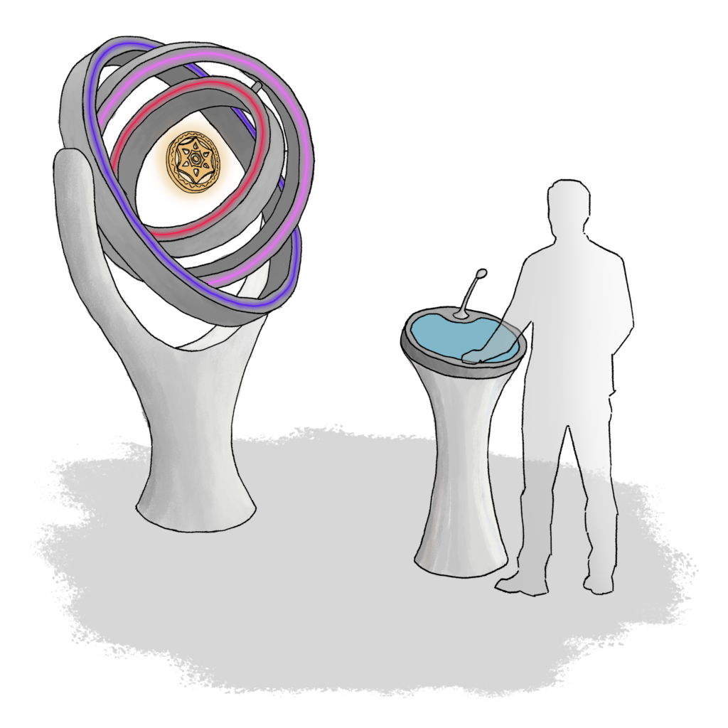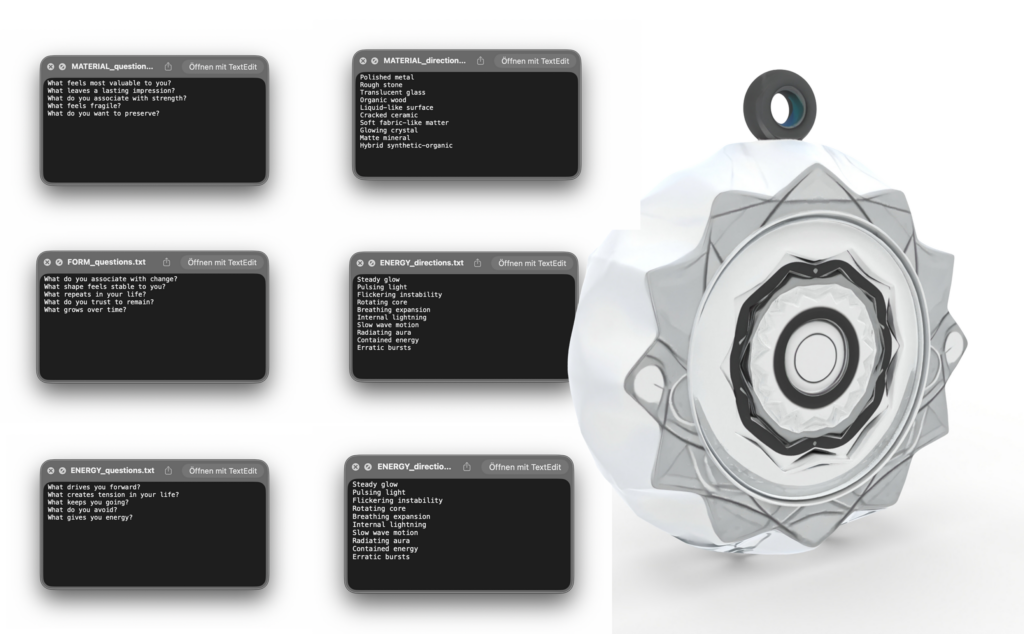 My next approach was to stay on the scale of one person, but this time the AI wouldn’t try to improve the person’s life. Instead, it would design something for them. There would be a somewhat mysterious machine that asks the user a series of questions and then creates a personal lucky charm in the form of a small amulet.